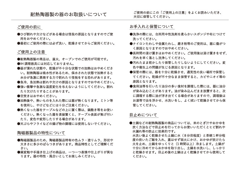 耐熱陶器のお取扱いについて(